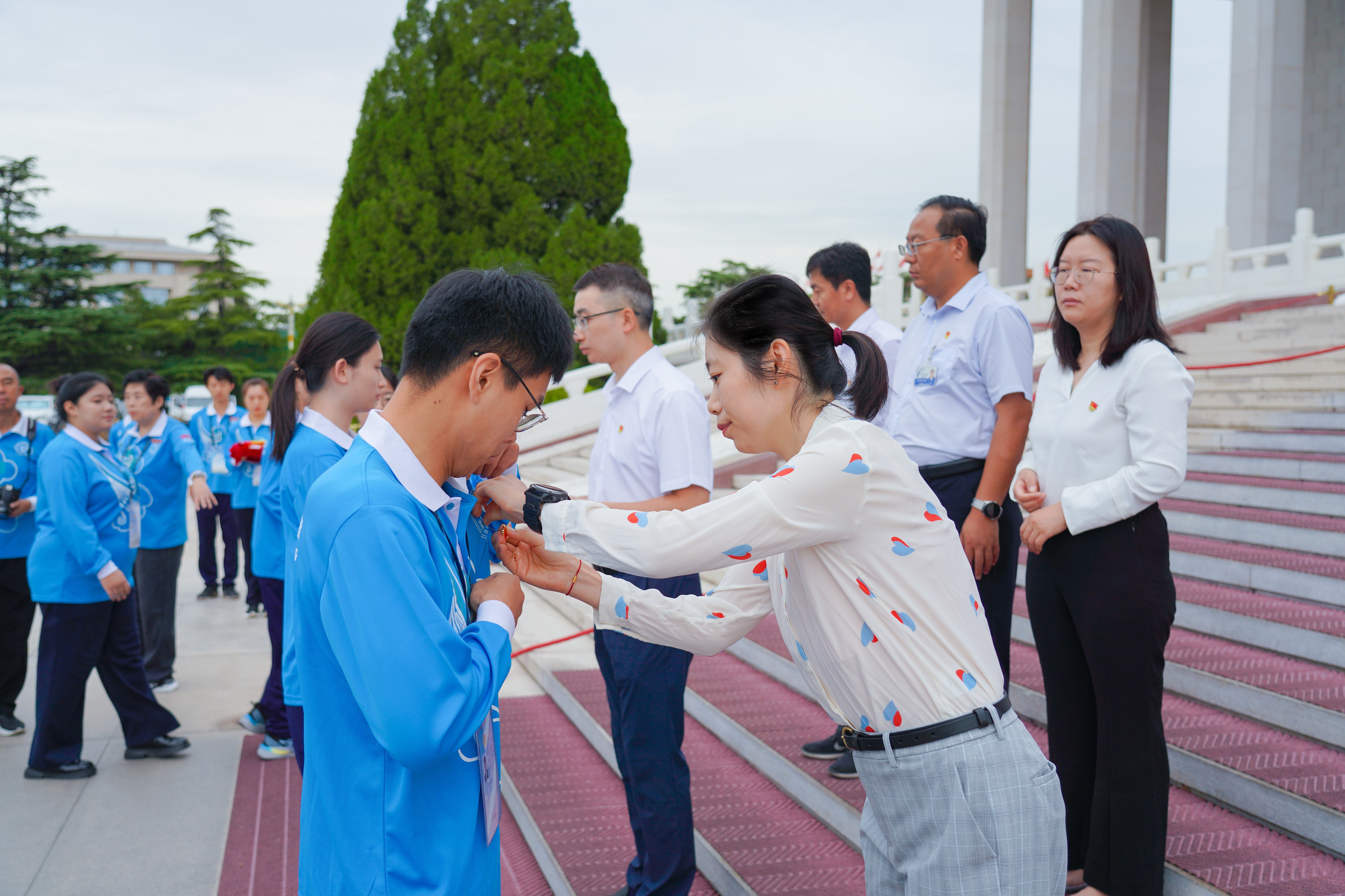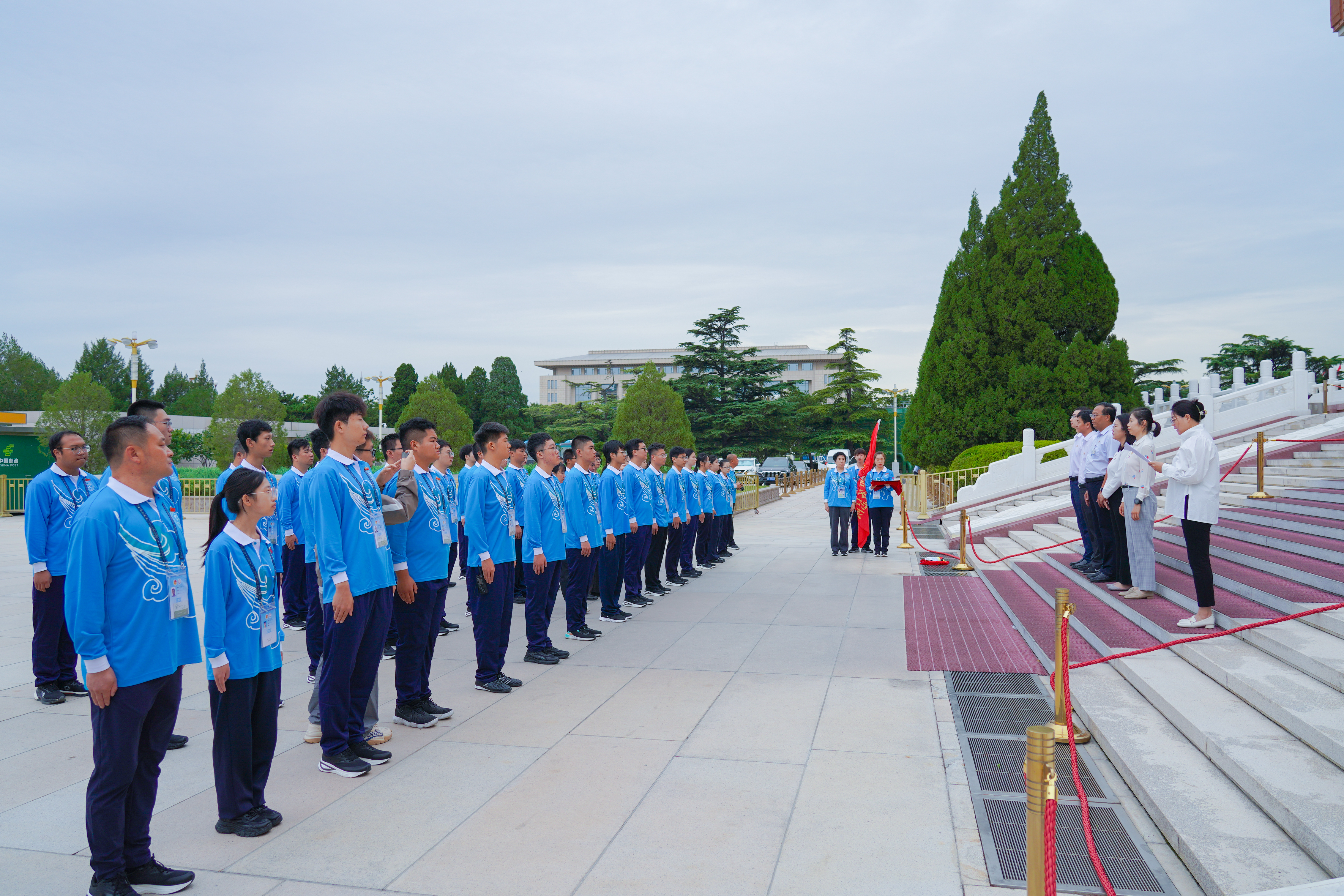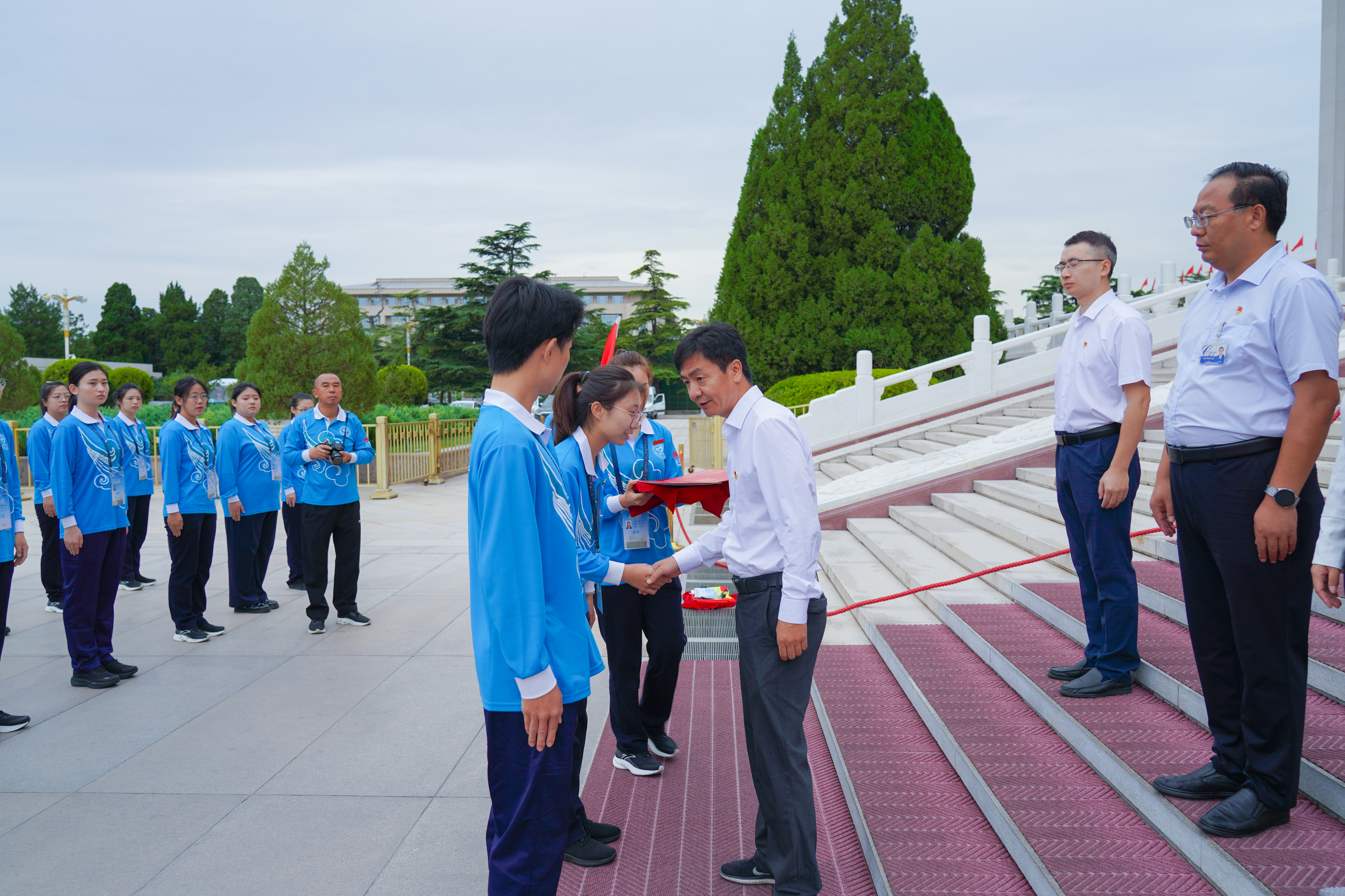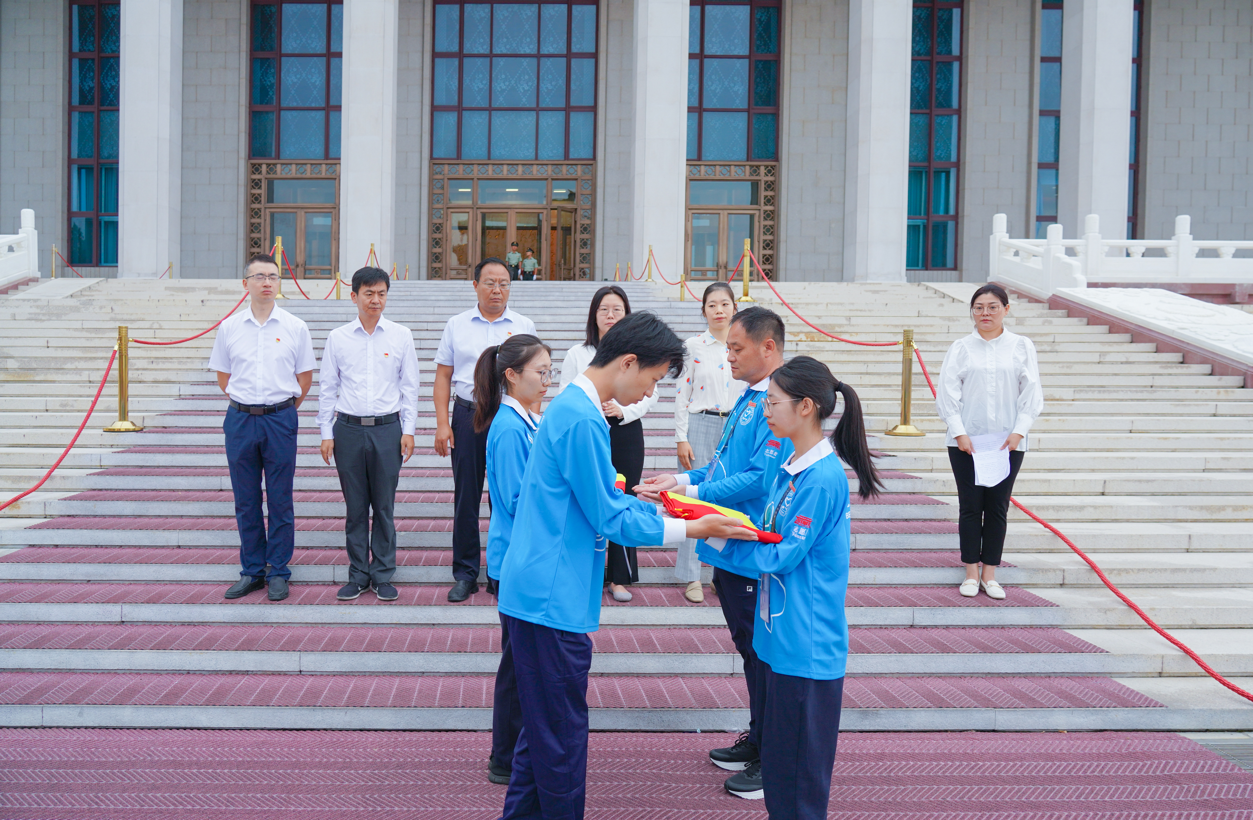 9月3日6點50分,第12批毛主席紀(jì)念堂志愿者上崗儀式在毛主席紀(jì)念堂舉行。毛主席紀(jì)念堂管理局瞻仰接待處處長馬恒祥、北京團(tuán)市委企業(yè)部副部長薛淑婭、北京市志愿服務(wù)指導(dǎo)中心副主任劉贏、一輕控股團(tuán)委副書記黃娟娟、中建五局北京公司黨委副書記劉宇軒等相關(guān)負(fù)責(zé)同志出席上崗儀式,來自北京輕工技師學(xué)院、中建五局的46名志愿者參加儀式。